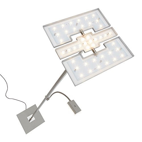 Moderne, höhenverstellbare Stehleuchte in matt-nickel. Sie ist ausgestattet mit festverbauter LED Platine mit einer durchschnittlichen Betriebsdauer von 20.000 Stunden. Dies entspricht einer Lebensdauer von ca. 15 Jahren bei einer Nutzung von 3,5 – 4 Stunden täglich. Die langlebigen, energiesparenden LED Module geben ein angenehmes warmweiß strahlendes Licht ab (3.000 Kelvin). Diese LED Stehlampe hat einen Energieverbrauch am Fluter von 1 x 21 Watt und am Lesearm 1 x 3,5 Watt und eine Lichtleistung von 1 x 2.000 Lumen und 1 x 300 Lumen. Die Leuchte ist ausgestattet mit einem stufenlos dimmbaren Touchdimmer. Der Fluterkopf ist schwenkbar und die Lampe hat einen ON / OFF Schalter.
